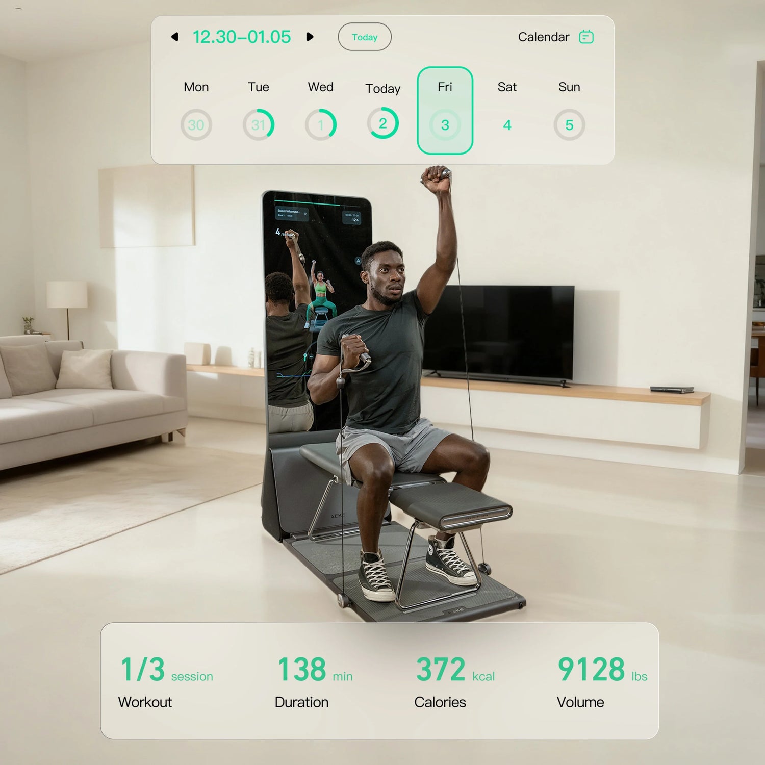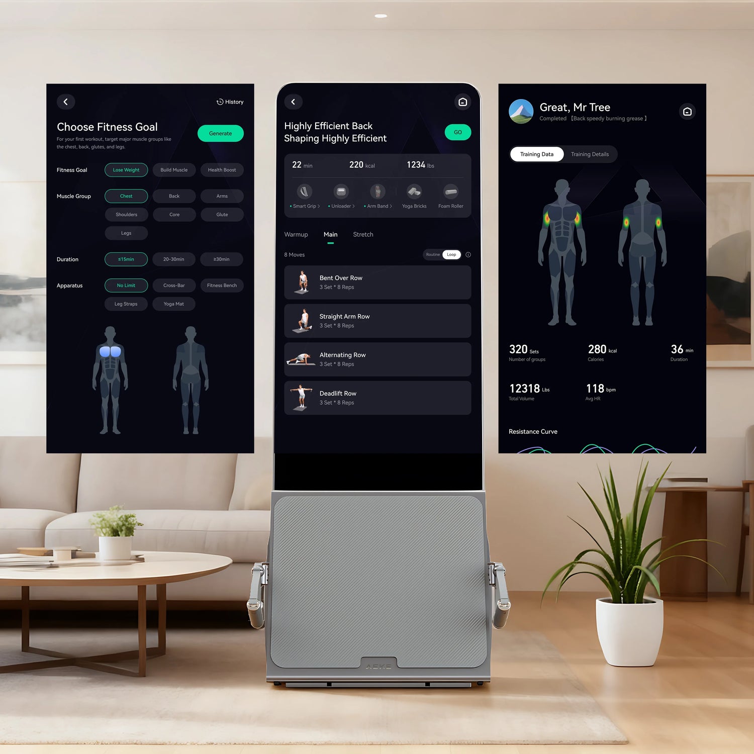 AEKE K1 bietet die umfassendste KI-Integration, die Ihr Fitnesslevel und Ihren Anpassungsfortschritt in Echtzeit analysiert und maßgeschneiderte Trainingspläne erstellt. Mit über 320 Übungen und 200 angeleiteten Kursen sorgt es dafür, dass jede Einheit effizient und effektiv ist. AEKE K1 macht das Training einfach, effektiv und stressfrei und berücksichtigt die unterschiedlichen Fitnesslevel und Bedürfnisse von Ihnen und Ihren Familienmitgliedern.